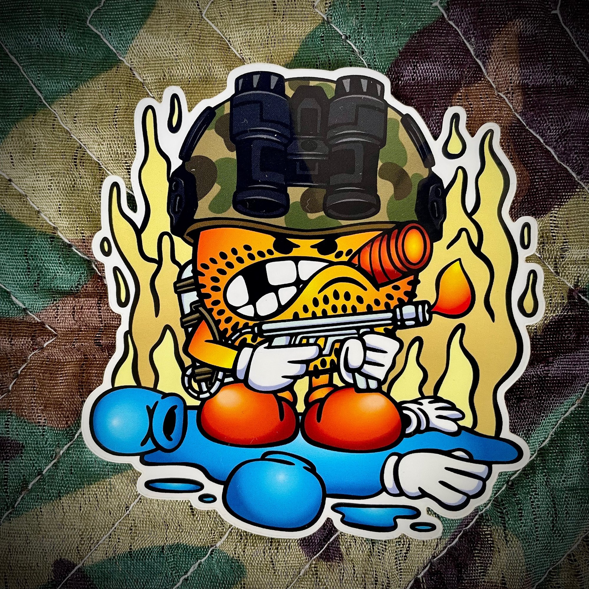 High quality 4" x 3.9" die-cut vinyl sticker. Laminated with a UV protective finish for outdoor use. Perfect for skateboards, ammo cans, Pelican cases, car windows, or water bottles.